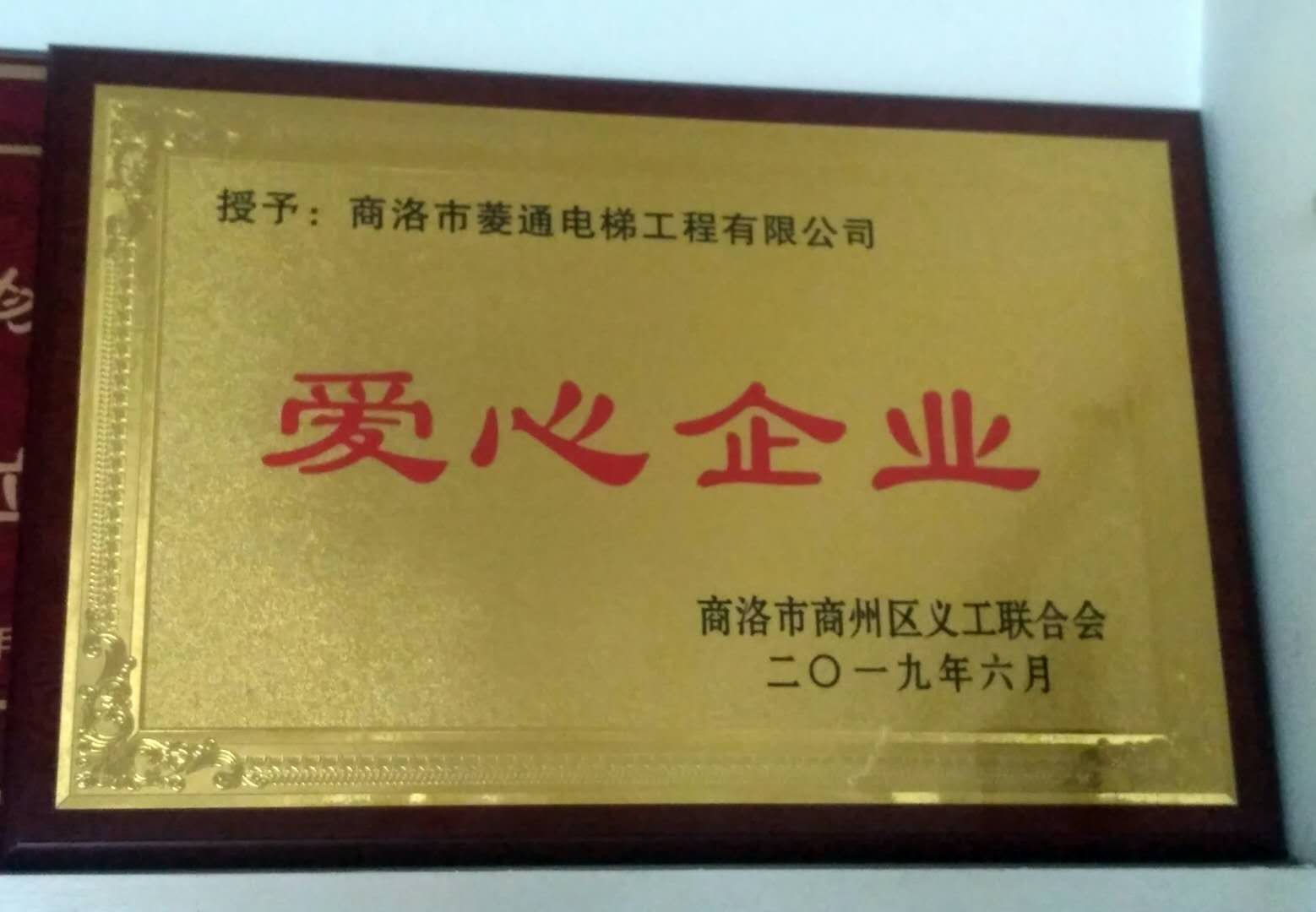 商洛市商州區(qū)義工聯(lián)合會授予:商洛市菱通電梯工程有限公司愛心企業(yè)獎牌一個